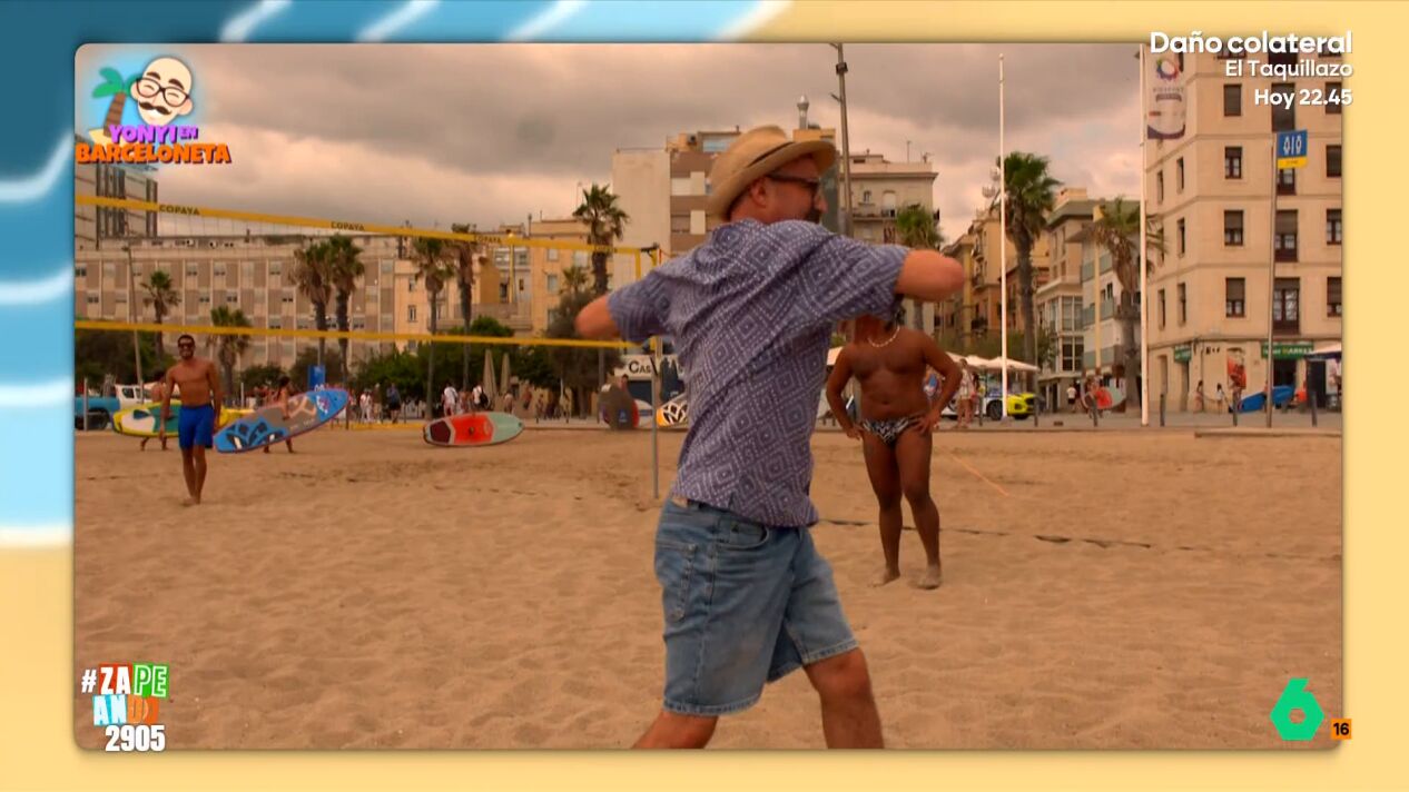 Otra anuncia que todos los días hacen aquagym en la Barceloneta. La monitora se acerca y le enseña un movimiento a Yonyi. "Me está costando un poquillo...", afirma el reportero. Finalmente, Arenas decide valorar la playa con cinco pelotas de playa en diversión, tres toallas en relax y tres palmeras en cuanto a su belleza.