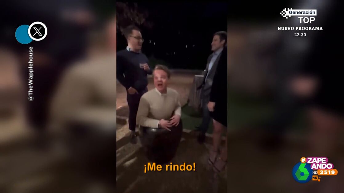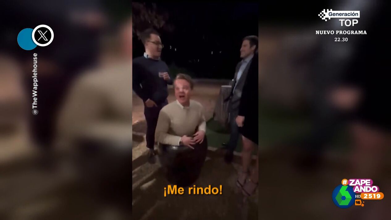 Estos lo ponen de pie, pero él empieza a sumir que se va a quedar ahí dentro "como un caracol o el genio de la lámpara", bromea el zapeador. "¡Me rindo!", espeta resignado, pero justo cuando la tragedia parecía que se iba a instalar en esa fiesta de Nochevieja, a alguien se le ocurre romper la pieza con un martillo.