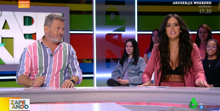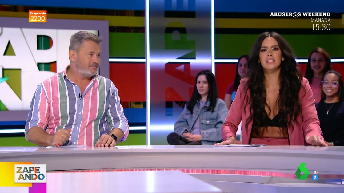 Dani Mateo comienza el último Zapeando de la semana saludando a los zapeadores Quique Peinado, Cristina Pedroche, Valeria Ros y Miki Nadal, a los que, asegura, "os veo muy lozanos y muy brillantes". En realidad, a todos menos a Miki, que acaba de cumplir 55 años.