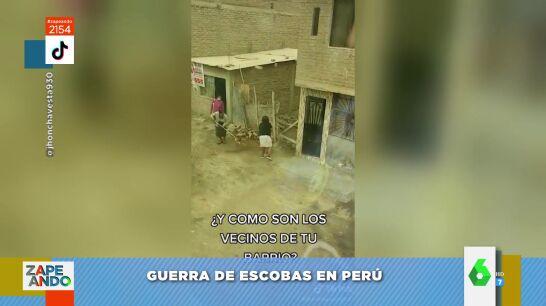 "Traigo unas durísimas imágenes de una batalla campal en Perú", anuncia Santi Alverú a sus compis de Zapeando, y les informa que se han hecho virales tanto por "la violencia de los contendientes" como por las armas que se han usado: "Unas peligrosísimas escobas", describe.