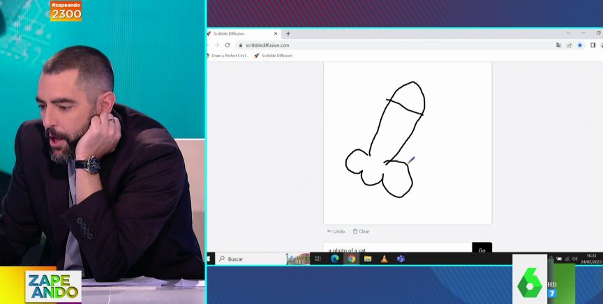 Sin embargo, y tras ver un vídeo viral en el que funciona, Dani Mateo se atreve a hacer un dibujo en riguroso directo para poner a prueba a sus compañeros, que tratan de adivinar de qué se trata, y a la inteligencia artificial.