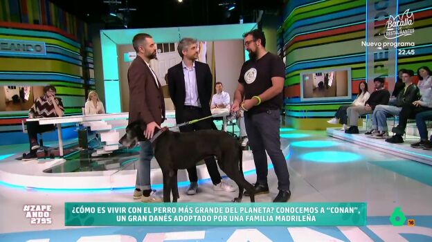 Víctor Algra visita Zapeando para contar la historia de Conan, un Gran Danés que fue adoptado hace ocho años por una familia de Segovia. Esta raza se caracteriza por ser la raza de perro con más altura del planeta. De media, puede medir más de 80 centímetros de alto y, de pie, puede alcanzar hasta 2,10 metros.