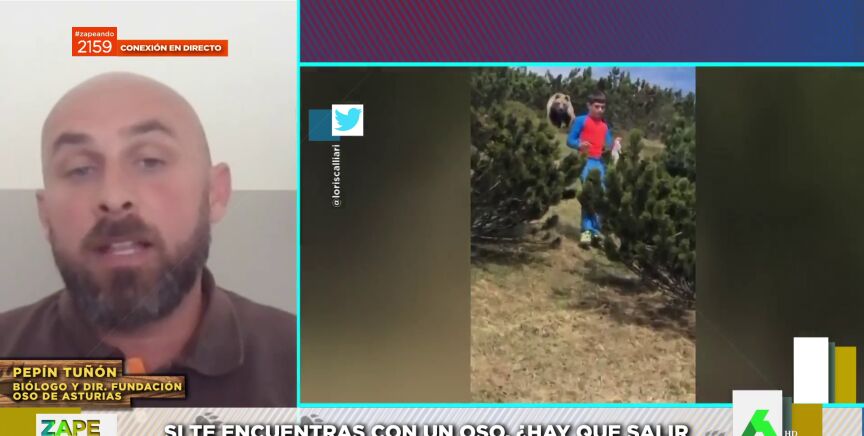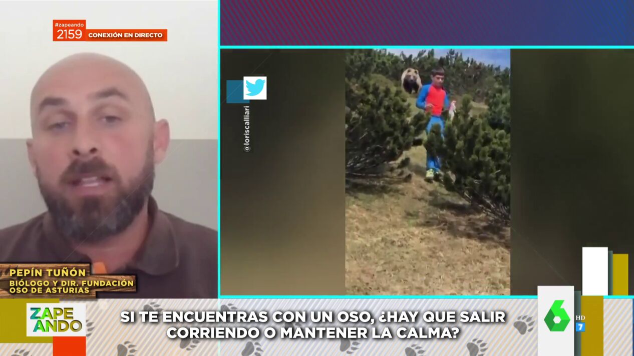 Pepín Tuñón, biólogo y director de la Fundación Oso de Asturias, conecta en directo con Zapeando para explicar cómo se debe actuar en el caso de que nos encontremos con un oso, como los protagonistas de los virales de Zapeando, que logran escaparse por los pelos. Lo primero que aclara es que "esto no ocurre en España", ya que se da en las "poblaciones cantábricas de osos": "Los de aquí son nocturnos y crepusculares y por norma general evitan el contacto con los humanos".