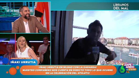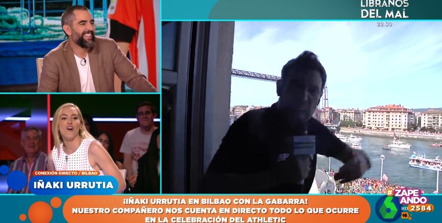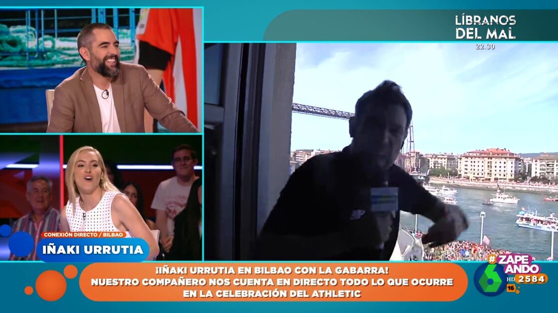 Iñaki conecta con el programa pletórico al paso de la gabarra. "¡Aupa, Athletic, 'txapeldun'!", grita el zapeador. "No se está cayendo ninguno de la gabarra, va todo más o menos bien", explica Urrutia. El zapeador está sorprendido por la cantidad de barcos que rodean a la embarcación donde van los jugadores del Athletic y, añade, que la gabarra va con cuerdas, que la lleva estirando.