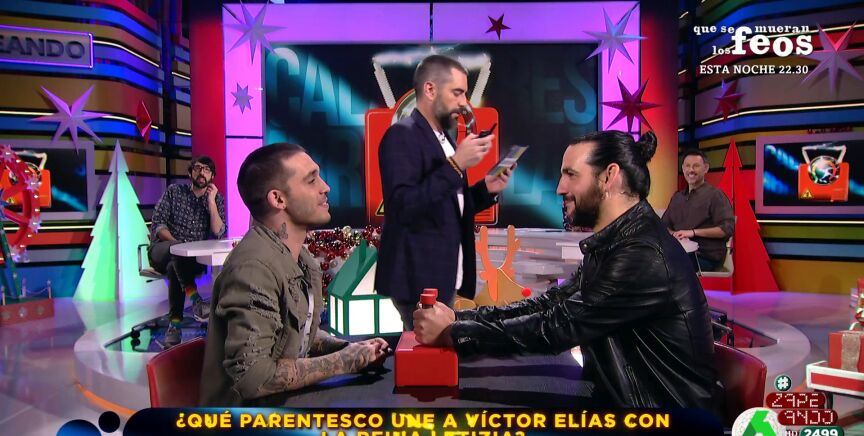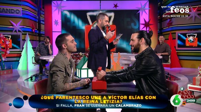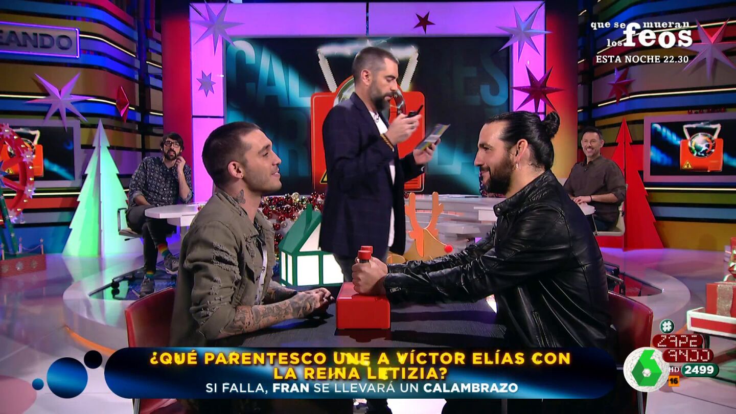 Ambos han empezado acertando. Fran Perea debía averiguar el parentesco de Víctor Elías con la reina Letizia. El artista ha acertado también la segunda pregunta sobre Elías, en la que debía decir en qué casting rechazaron a Víctor por ser demasiado mayor.