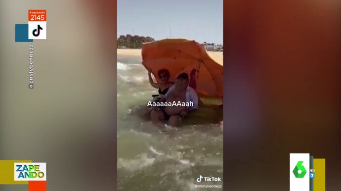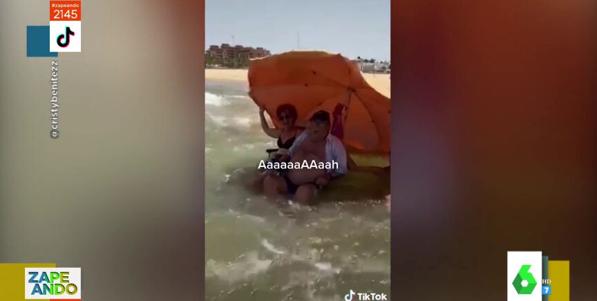 Una tik toker graba el momento en el que un carguero provoca una pequeña ola que, al llegar a la orilla donde estaba tan tranquilamente el abuelo en remojo, le engulle y le tira de la silla. Puedes ver la cómica escena, en este vídeo de Zapeando.