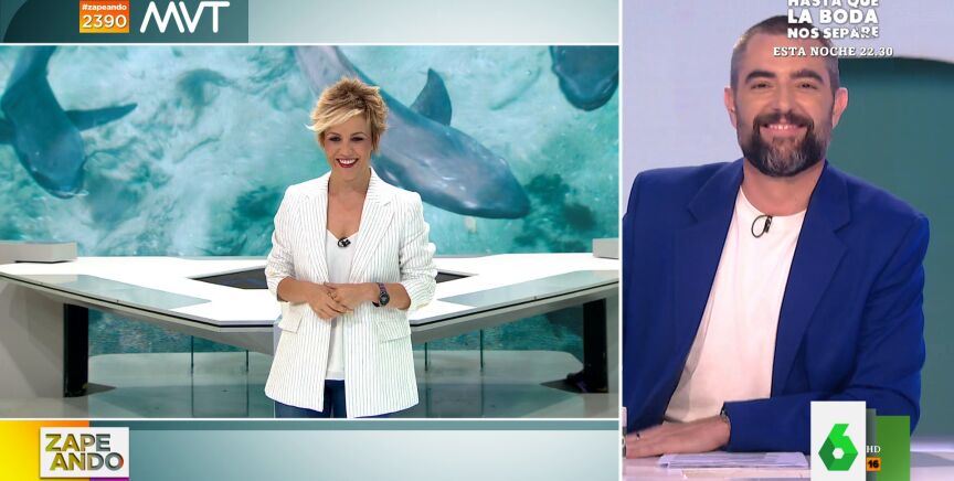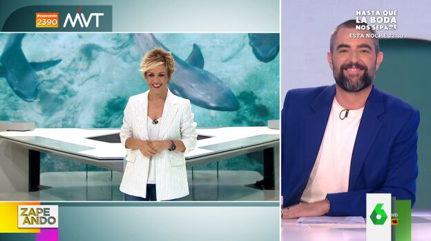 Cristina Pardo adelanta que en Más Vale Tarde contarán con un experto en tiburones que "lo que dice, entre otras cosas, es que estos animales son como los perros y que conviene no moverse mucho". Lo que provoca la ironía de Dani Mateo.