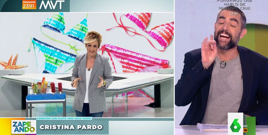 "Cualquier día pierdo la cabeza y en El Intermedio salgo en bikini", bromea Dani Mateo, a lo que Cristina Pardo responde: "¡Como si no lo hubieras hecho ya!". "Perdona, pero era trikini", le corrige el catalán, que asegura: "El bikini y el unikini todavía me faltan. El unikini lo guardo para el último día".