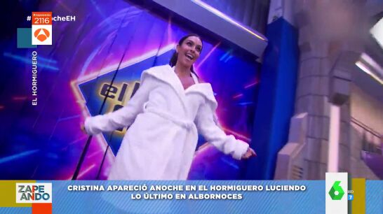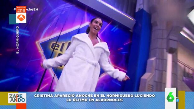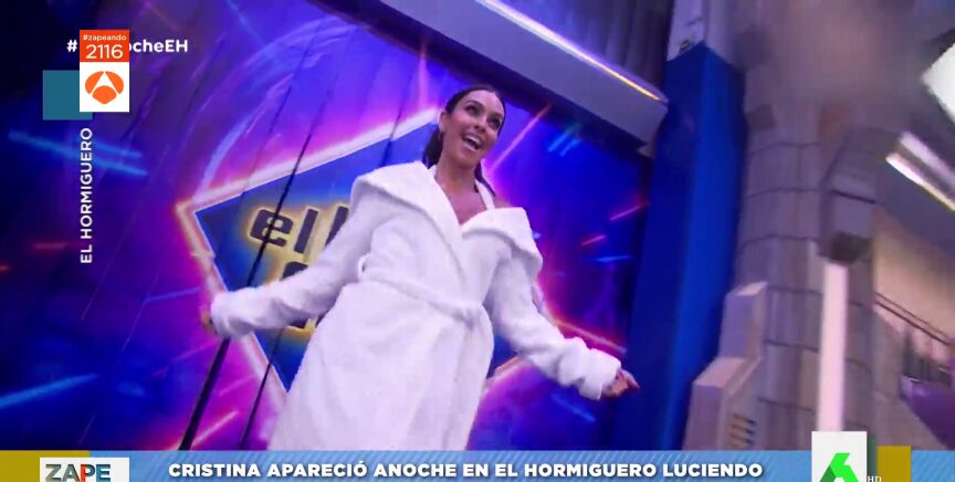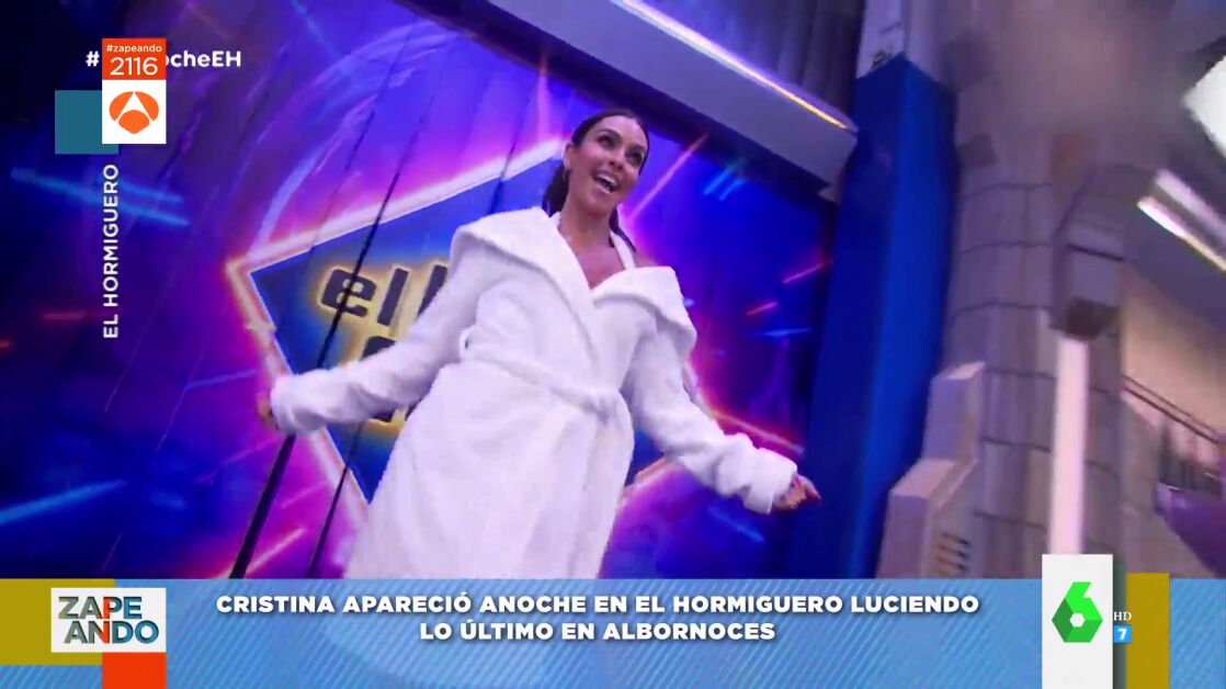 Cristina Pedroche ha visitado El Hormiguero. Desde el primer momento, la zapeadora llamó la atención de los espectadores, e incluso del propio Pablo Motos. Y es que Pedroche entró en el programa luciendo un albornoz blanco con unos tacones de diseño. Enseguida se lo quitó, pero debajo tenía un short y un top con tela de albornoz.