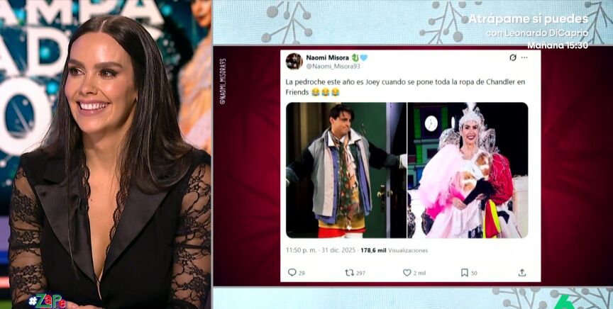 En el vídeo sobre estas líneas, Pedroche escucha en Zapeando algunos de los memes más divertidos que se leyeron en Nochevieja, entre ellos uno que identificaba la capa de la presentadora con ella misma "cuando recojo la ropa del tendedero y no quiero hacer dos viajes".