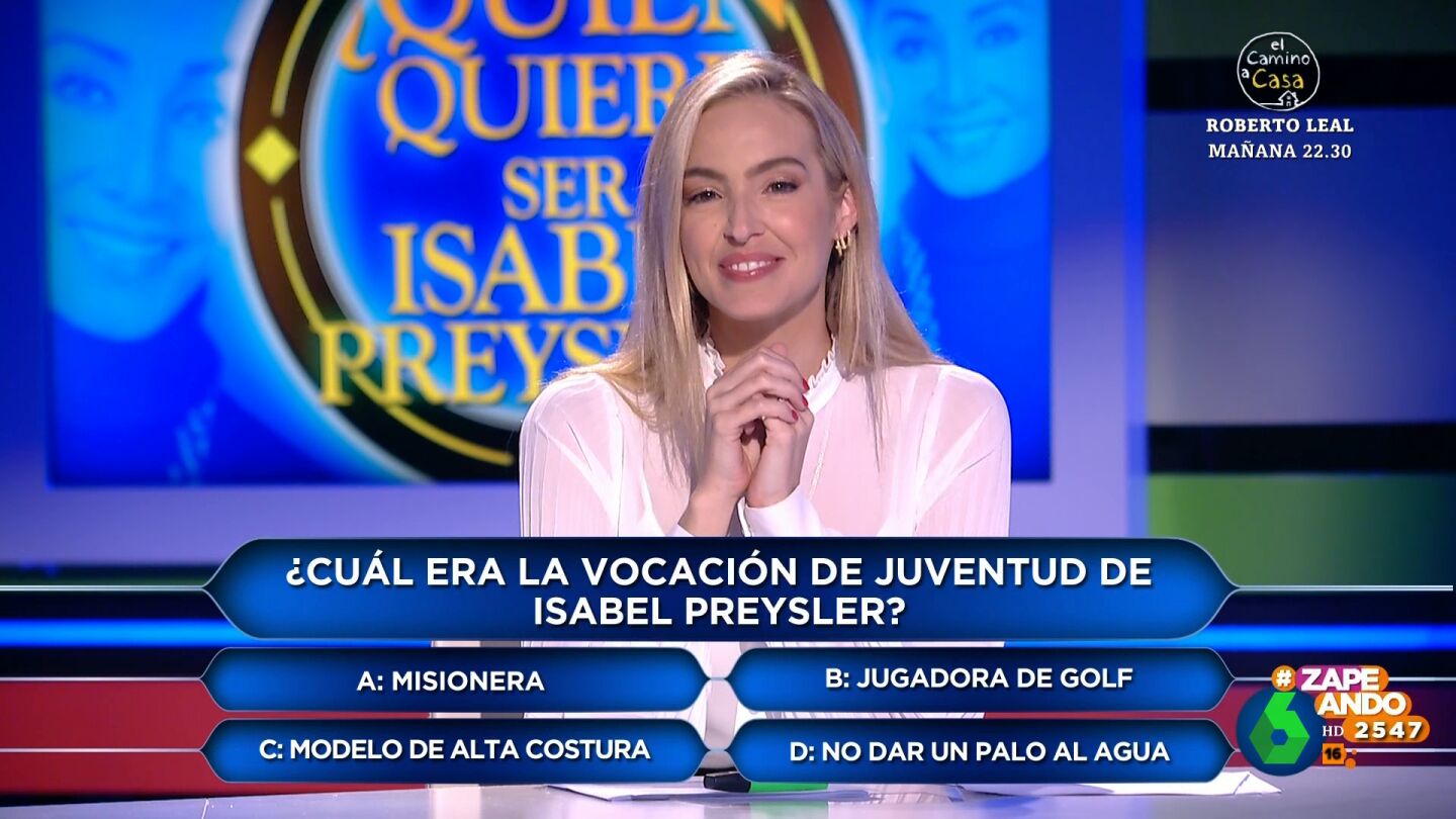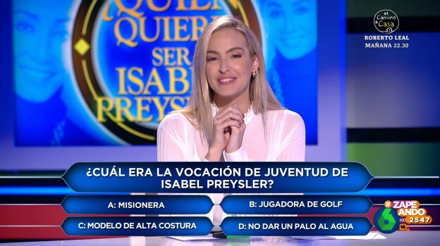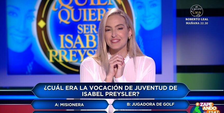 Los zapeadores deberán demostrar su conocimiento sobre Isabel a través de diversas preguntas. Miki Nadal pregunta a Isabel Forner cuál era la vocación de juventud de Preysler. Entre las opciones que puede escoger están: "Misionera, jugadora de golf, modelo de alta costura y no dar un palo al agua".