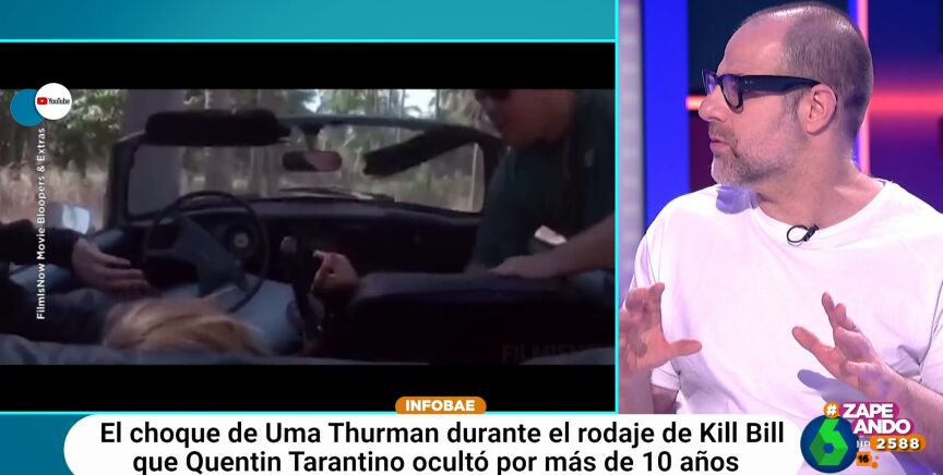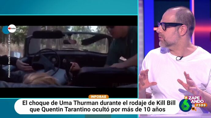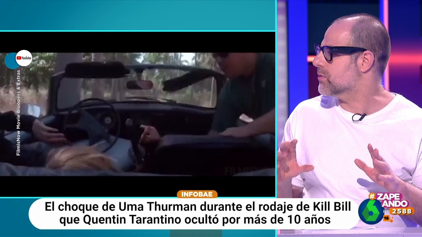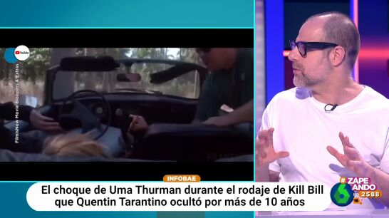 "Ella tenía que conducir, el coche no estaba en buenas condiciones, la carretera tampoco y, probablemente, quien tenía que dar las ordenes tampoco", expone el periodista. "Tarantino dio órdenes de hacerlo sin especialista y mandó acelerar a la actriz para que así su pelo quedaba mejor", añade.
