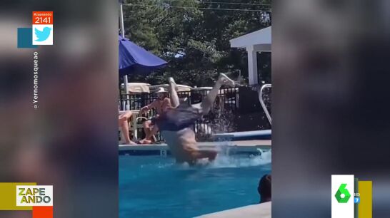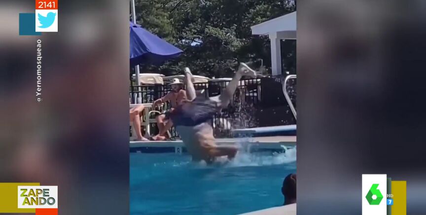 "Vamos ahora con algo refrescante para estos calores", anuncia Miki Nadal a sus compis de Zapeando, a los que informa de que se trata de una "nueva disciplina del salto de trampolín". Y, es que, el anciano protagonista de este vídeo viral se acerca al borde y, cuando intenta saltar, cae de culo sobre el trampolín y hace una voltereta hacia delante: "De culo y 360 para dentro", espeta el colaborador de Zaragoza.