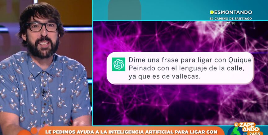 Para ligar con Quique Peinado, Maya le pide al Chat GPT que le sugiera una frase con lenguaje de la calle porque Quique "es de Vallecas". El sistema de IA sugiere la siguiente frase: "¡Ey Quique! Tienes ese rollo de Vallecas que me intriga un montón. Además, con esa barba y ese estilo que llevas, no dejas indiferente a nadie. ¿Qué opinas de compartir un rato de charla y ver qué onda?". Esta manera de ligar, según dice el de Vallecas, le parece más una frase que usaría la policía.