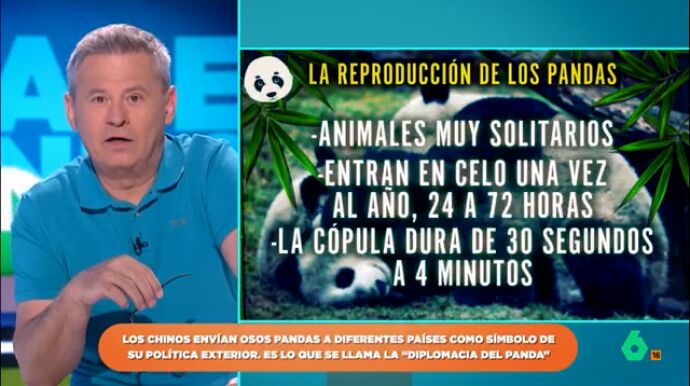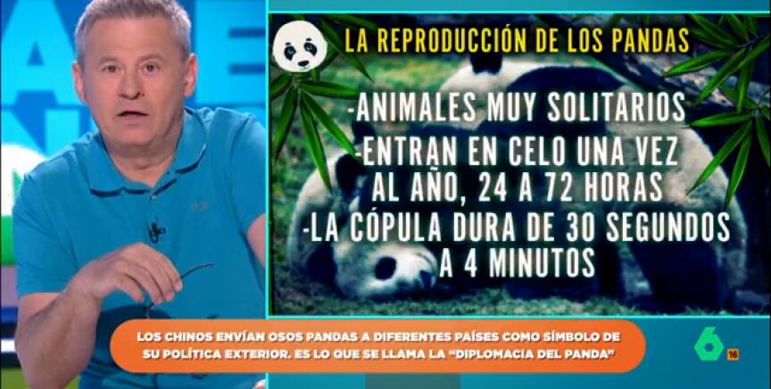 Los pandas son uno de los símbolos de China y, además, son animales muy queridos y entrañables. Por ello, Zapeando repasa algunos datos curiosos sobre estos animales como, por ejemplo, sus hábitos reproductivos. Como apunta Miki Nadal, a la hora de reproducirse son muy especiales. "Es un animal muy solitario, no le gusta vivir en comunidad", indica.