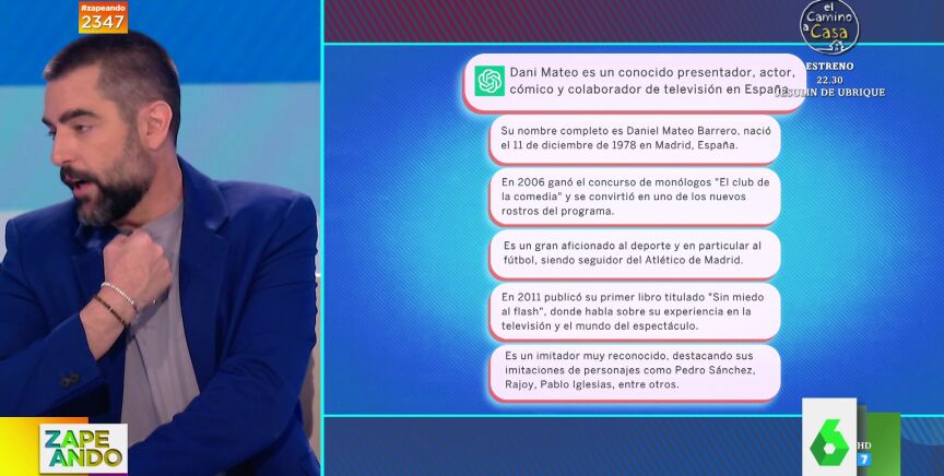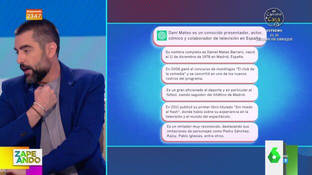 Tras el aviso, el humorista le ha preguntado algunas curiosidades sobre Dani Mateo y, efectivamente, ha descubierto detalles que hasta él mismo desconocía, como que nació en "Madrid" o ha ganado "el concurso de monólogos 'El club de la comedia'".