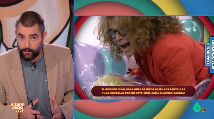 Santi Alverú vuelve, una tarde más, con su sección 'El día del espectador'. En esta ocasión, Dani de Madrid pregunta por el estado de salud de Torito después de pegarse un golpetazo este jueves en Zapeando cuando estaba probando un invento de Jiaping que consistía en crear una cama con una bolsa de vacío y varios globos. Al verlo, el colaborador todoterreno no dudó en saltar sobre ella con la mala suerte de que acabó comiéndose el suelo, una reacción que ninguno de los colaboradores se esperaba.