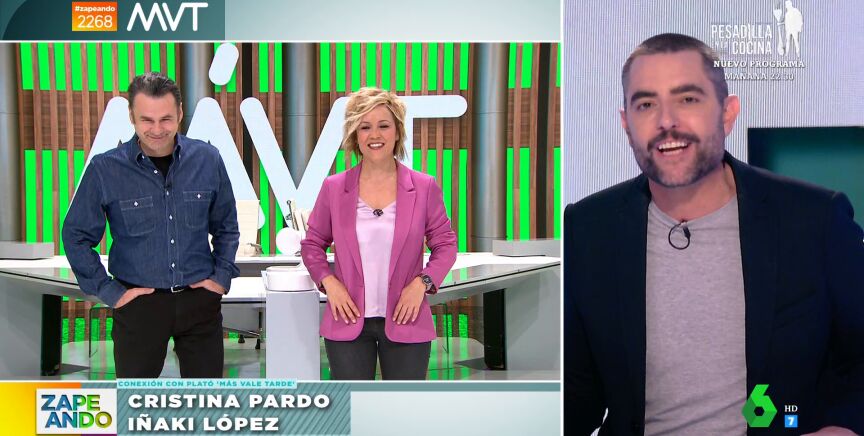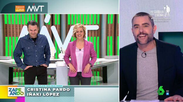 "Es la hora", destaca Dani Mateo al conectar con el plató de Más Vale Tarde antes de terminar Zapeando para hablar con Cristina Pardo e Iñaki López. "Cómo estará la familia como que, para reformar al nieto, le manden con el rey emérito", destaca Cristina Pardo mientras Dani Mateo afirma que cree que lo han hecho para que "acabe de explotar en el desierto con una detonación controlada".