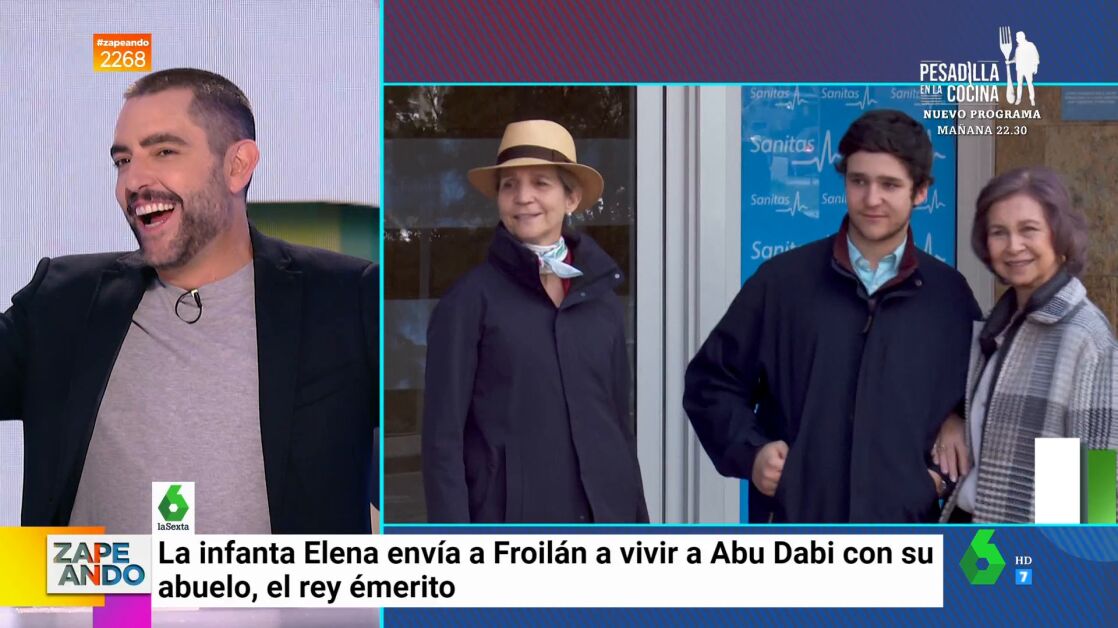 Dani Mateo arranca Zapeando con una sorprendente noticia: la infanta Elena va a enviar a su hijo a Abu Dabi con el rey Juan Carlos. "La mismísima infanta Elena ha tenido que tomar medidas para meter en vereda a Froilán", afirma Dani Mateo, que destaca que "es como Heidi, pero nada que ver".