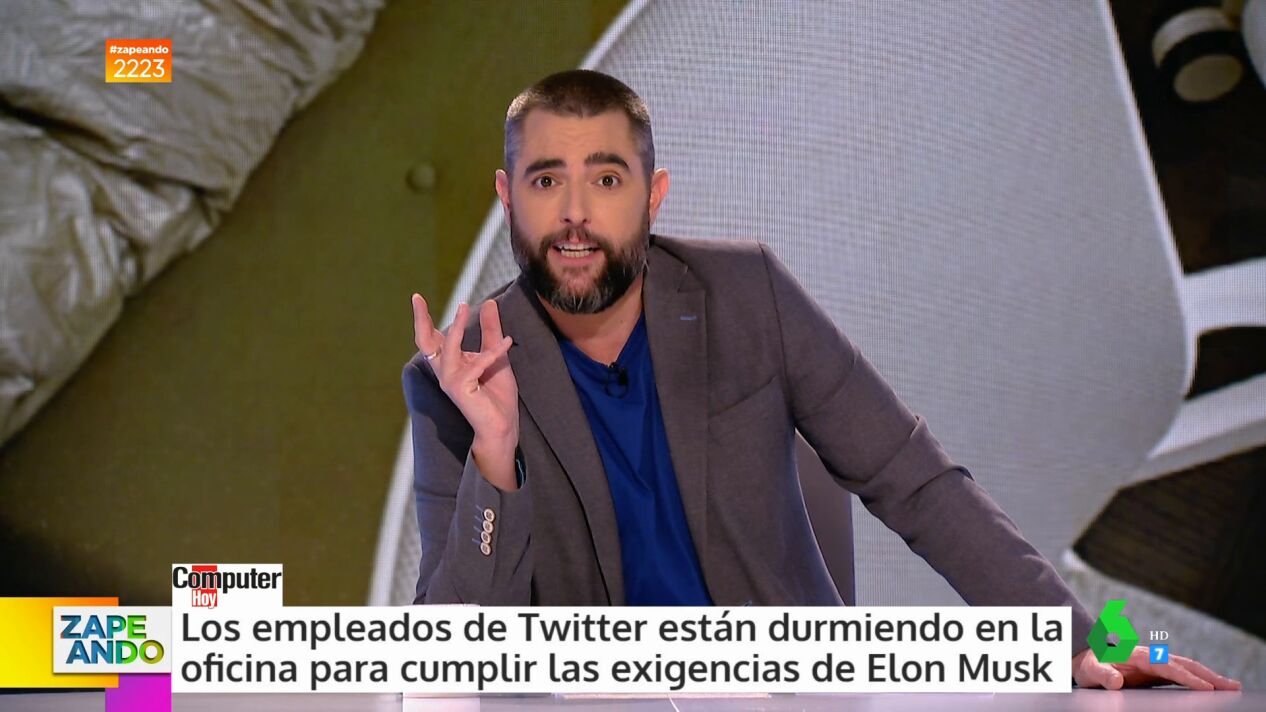 "Pero esto ¿qué es, el tío GiliMusk?", comenta Valeria Ros, mientras Dani Mateo asegura que "ahora mismo las oficinas de Twitter huelen a pájaro, pero de verdad". Los zapeadores también desvelan qué opinan de Elon Musk y de su sistema de verificación para la red social: "¿A esto hemos llegado en la vida? ¿Hay que pagar para que otro te diga 'si, eres tú'?", se pregunta el presentador del programa en el vídeo sobre estas líneas.