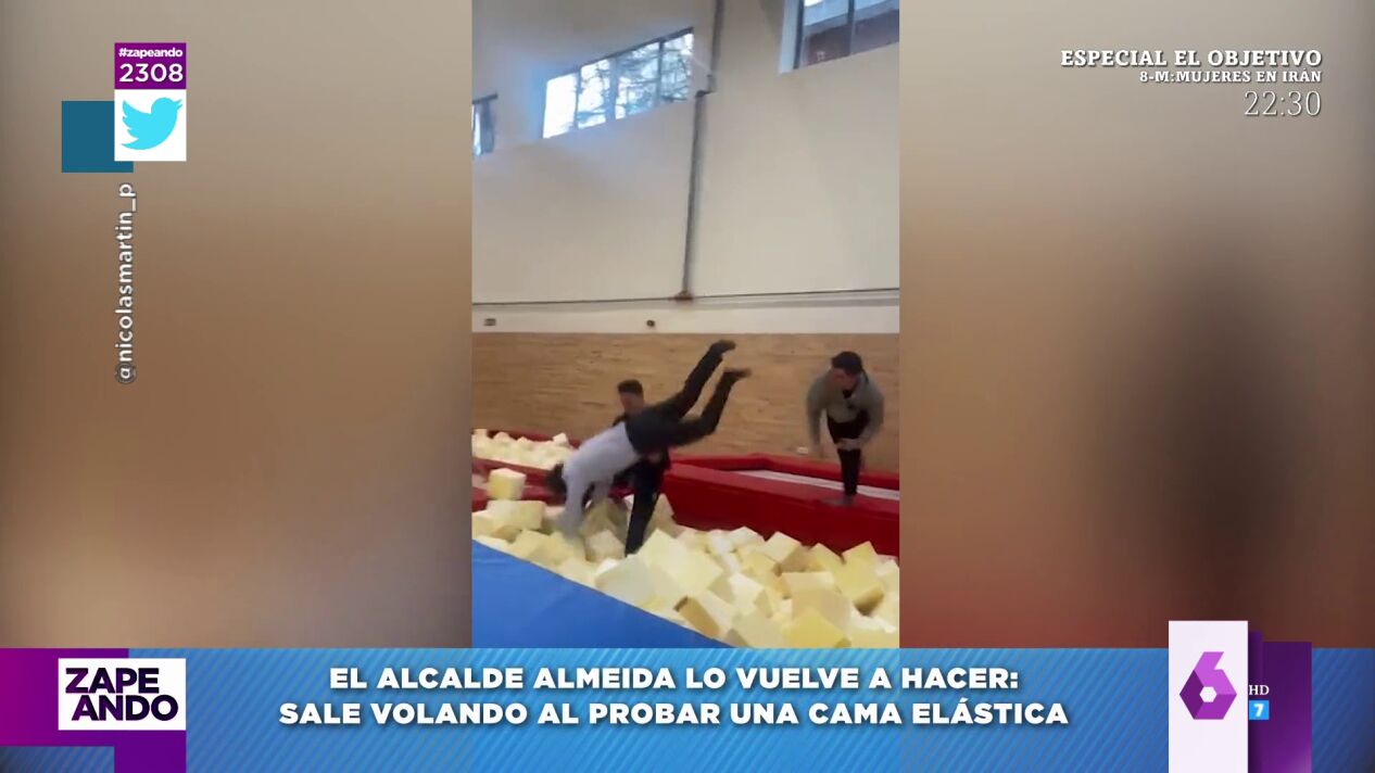 Tras inaugurar un polideportivo en un barrio de Madrid, el alcalde pensó que era buena idea ponerse a saltar en una cama elástica y ¡spoiler! ¡no lo fue! "No sabemos si Almeida no domina el concepto saltar en cama elástica o quiso emular a la protagonista de Dirty Dancing", destaca Iñaki Urrutia, que afirma que solo el alcalde sabe lo que pasa en "esa cabecita rubia".
