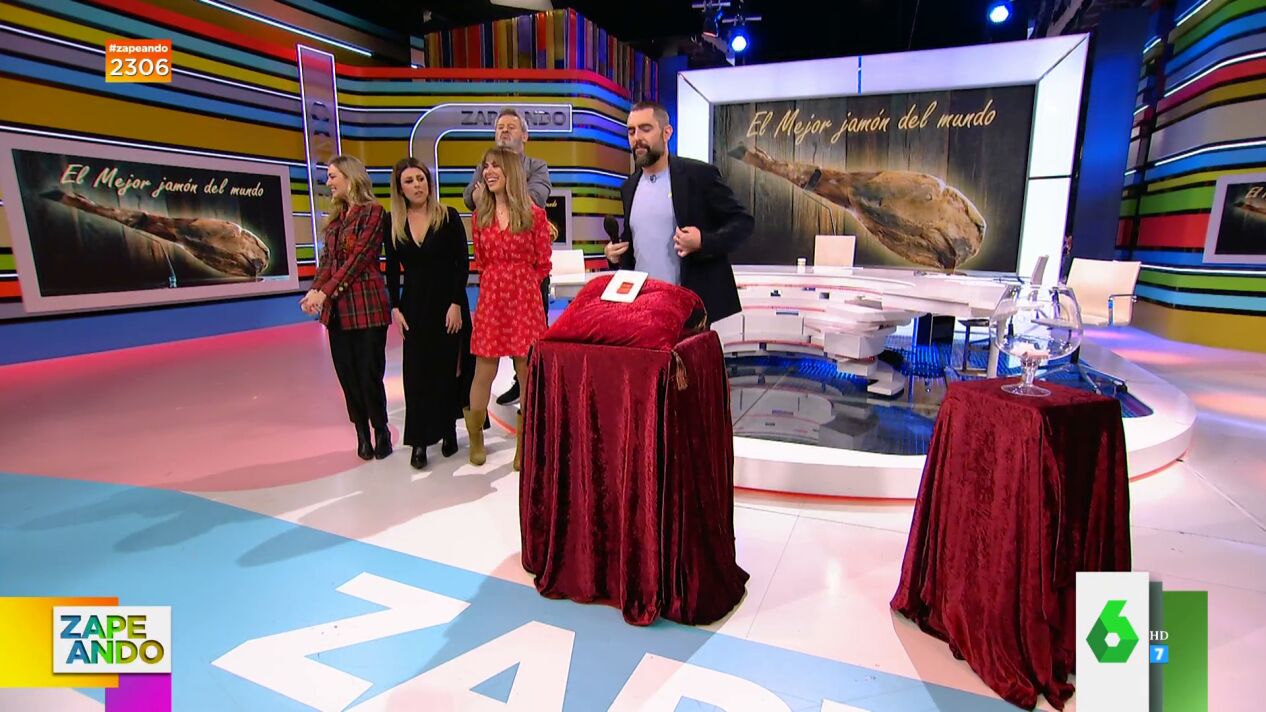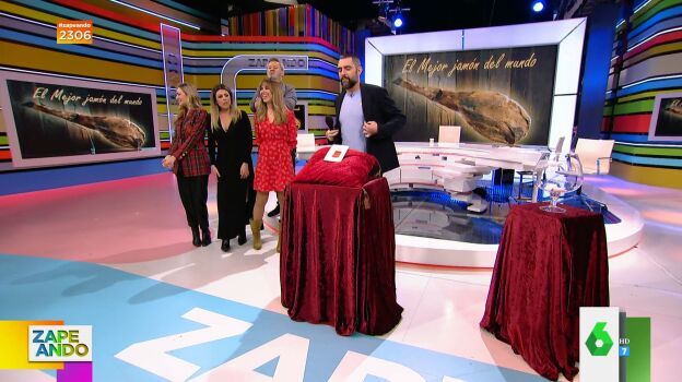 Dani Mateo pide a Mónica, una espectadora que se encuentra entre el público, que sea la encargada de sacar el papel que decida quién de los zapeadores será el que coma el mejor jamón del mundo. Y es que en el plató de Zapeando se encuentra una loncha de dicho jamón y todos están deseando que les toque.