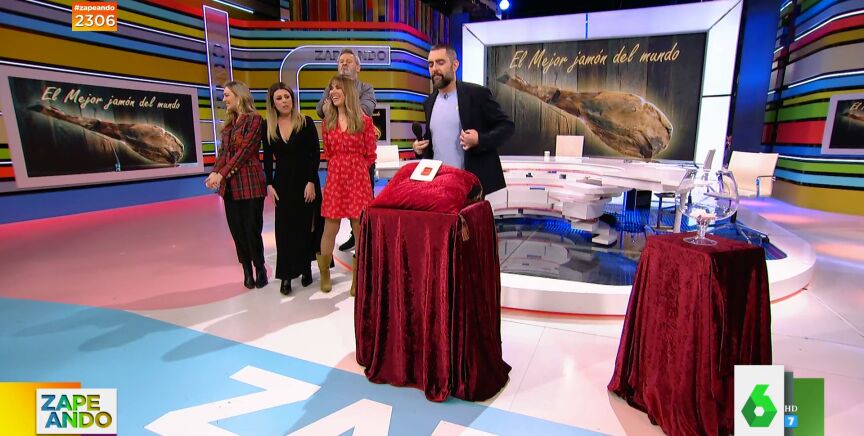 Dani Mateo, Valeria Ros, Miki Nadal, María Gómez e Isabel Forner concursaban por ser el elegido para probar en pleno directo de Zapeando una loncha del mejor jamón del mundo, pero