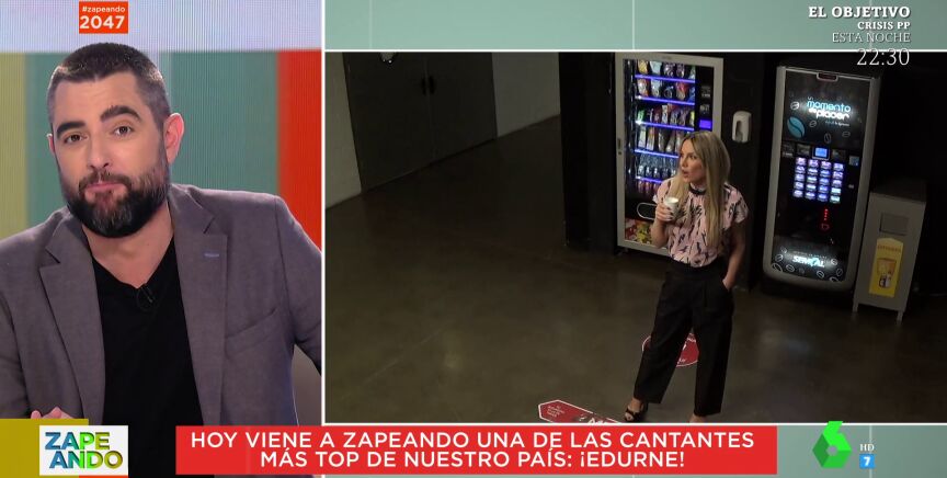 "¿Sabéis quién está en este instante tomando un cortadito en la máquina de café de Zapeando?", pregunta Dani Mateo en plató, donde conecta en directo con la zona de las máquinas. "No sé quién la habrá engañado para venir a vernos", confiesa el presentador al conectar con Edurne, que saluda a cámara de forma entusiasta.