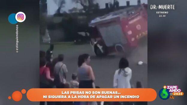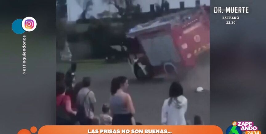 Los bomberos acuden con gran celeridad hasta el lugar donde un coche está envuelto en llamas, pero, al intentar detener el camión, el vehículo se desequilibra y terminan volcando ante la mirada atónita de los presentes.