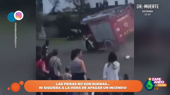 Un coche en llamas en medio de la calle alerta a los vecinos, que llaman a los bomberospara que apaguen el incendio. Estos acuden a toda velocidad hasta el lugar pero, en el momento de detener el camión, giran bruscamente y este da bandazos hacia un lado y hacia otro hasta que vuelca.