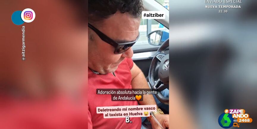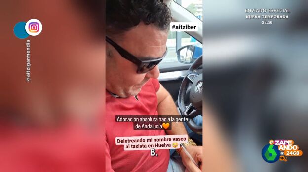 La actriz Aitziber Garmendia pide a un taxista onubense el justificante de la carrera y viven un cómico momento cuando este tiene que escribir su nombre en el resguardo. Puedes verlo en este vídeo de Zapeando.