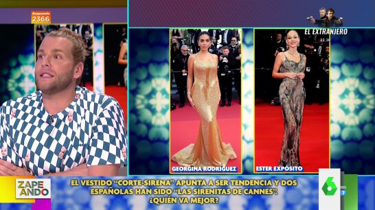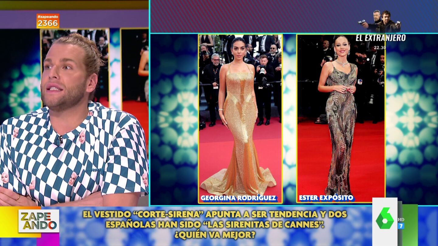 Eduardo Navarrete opina sobre los vestidos de corte sirena que lucieron Georgina Rodríguez y Ester Expósito en el Festival de Cannes. ¿A cuál le quedará mejor el look? Escucha su veredicto en este vídeo de Zapeando.