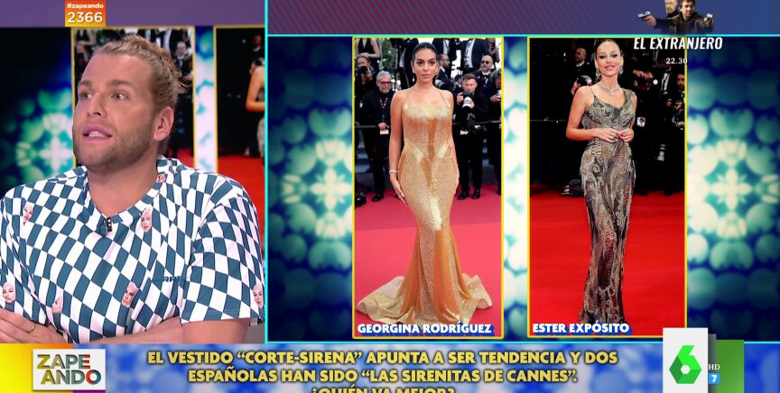 Eduardo Navarrete analiza en Zapeando los looks que llevaron Georgina Rodríguez y Ester Expósito en el Festival de Cannes. Mientras que la de Jaca escogió un vestido de corte sirena en color dorado con el que iba "tan ceñida que parecía un Oscar", según Quique Peinado; la actriz se decantó por otro vestido de corte sirena pero con pedrería y transparencias. "Iba ideal y seguro que muy cómoda", valora Cristina Pedroche.