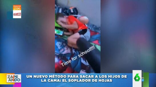En el vídeo principal de la noticia puedes ver cómo un padre utiliza un soplador de hojas, "de los que se usan para limpiar el jardín", aclara el presentador de Zapeando, para sacarles de la cama. Y, es que, "el soplador puede con todo, con sábanas, mantas, edredones y legañas", resalta Dani Mateo.