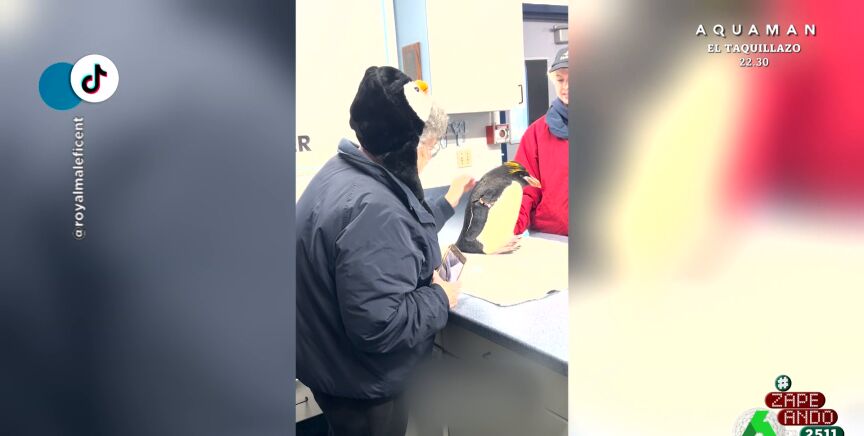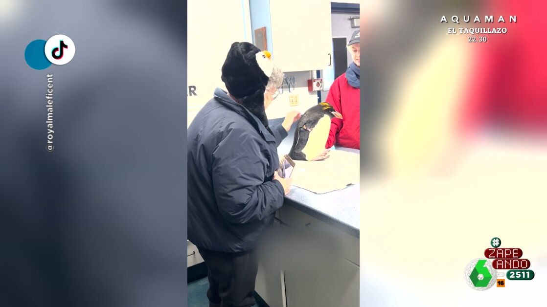 La señora termina de acariciar al animal y, al girarse hacia la cámara, se muestra visiblemente emocionada por el momento que acaba de vivir. La mujer, además, ha decidido utilizar un gorrito con forma de pingüino para hacer más especial el momento.