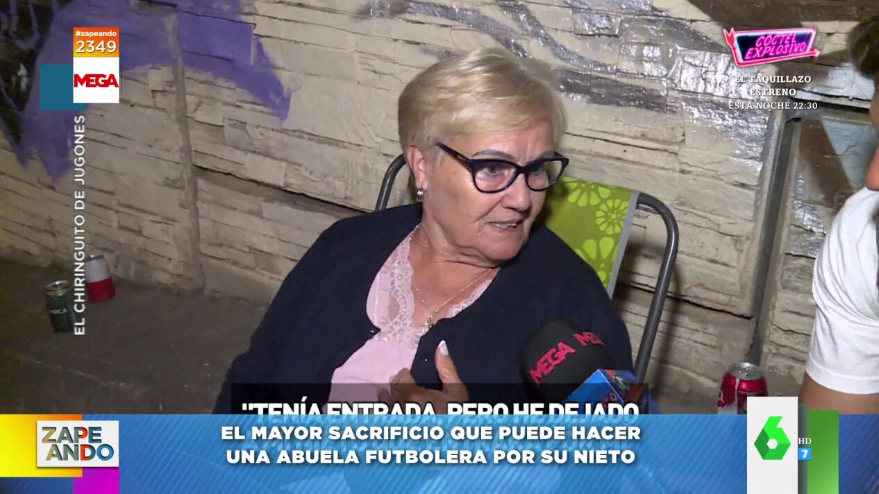 Un reportero de El Chiringuito entrevista a una mujer en los aledaños del estadio donde se disputó la final de la Copa del Rey. Esta es la prueba de que una abuela es capaz de hacer cualquier cosa por su nieto.