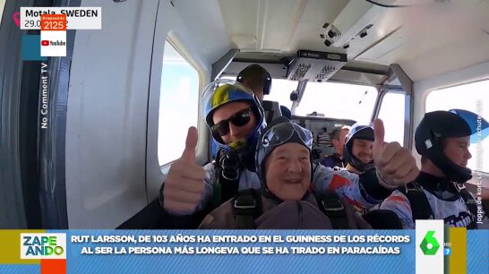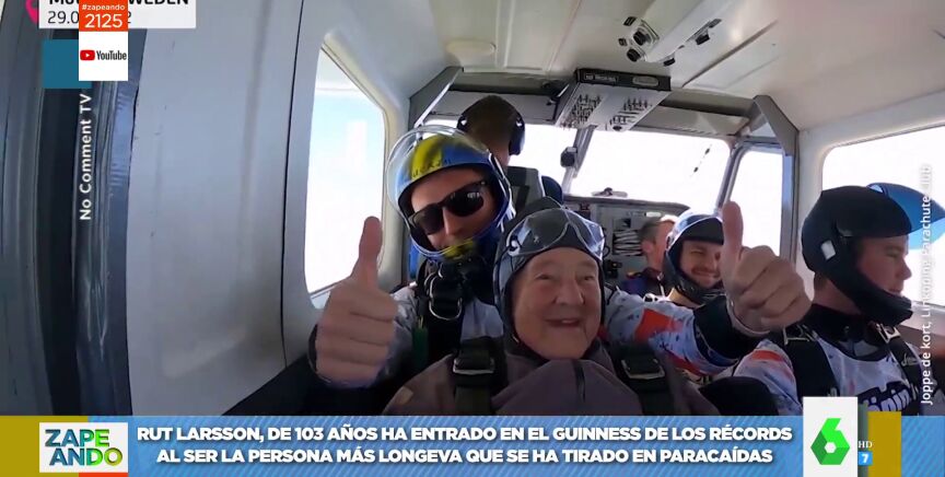Rut Larsson, una anciana de 103 años de origen sueco, ha entrado en el Libro Guinness de los Récords tras convertirse en la persona más longeva en saltar en paracaídas. "Lo ha hecho con 103 años", informa Quique Peinado a sus compis, a los que acto seguido pide un "fuerte aplauso". Tal y como informa el colaborador, esta señora voló por primera vez en parapente con 90 años y debutó con el paracaídas a los 102 años, pero como le gustó, ha vuelto a repetir este año.
