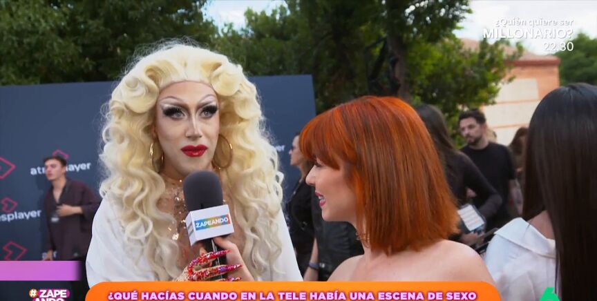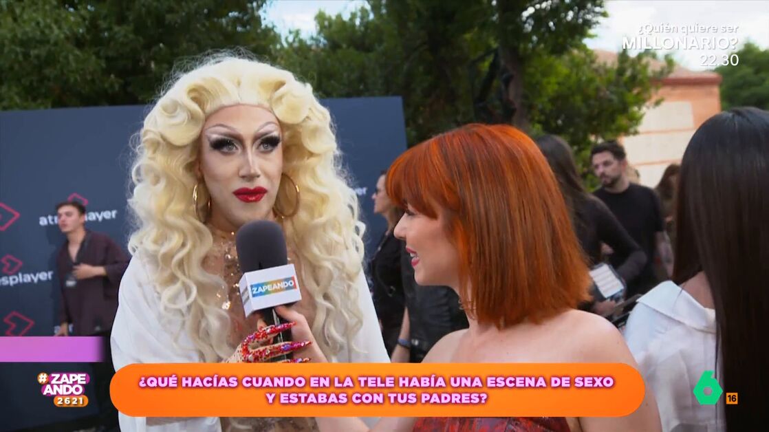 La reportera también les pregunta por alguna escena de 'dos rombos' en la que hayan sufrido viéndola con sus padres. Samantha Ballentines recuerda la primera vez que vio 'Showgirls' en la televisión. "En mi casa todo el mundo decía que era una película que él no podía ver pero... mira, así he acabado, una travesti", afirma.