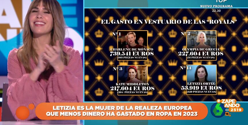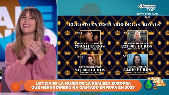 "Aquí hay más caspa que en un anuncio de champú de Iker Casillas", comenta la colaboradora de Zapeando, que en el vídeo sobre estas líneas desvela que Letizia ha sido la que menos dinero se ha gastado de todas, con 53.919 euros en 129 piezas nuevas que la sitúan en el puesto 14. "Es la última en gasto, pero la primera en ahorro", comenta María Gómez.