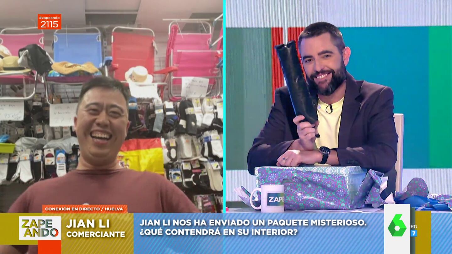 Jian Li, el Chinito de Huelva, que enamoró a los zapeadores con su arte para vender los productos de su tienda, ha mandado una caja misteriosa al programa. "¿De qué va todo esto?", se pregunta Dani Mateo, para acto seguido dar paso, en directo, al mismísimo Jian Li. "Es un regalo para todos", comenta el tik toker divertido.