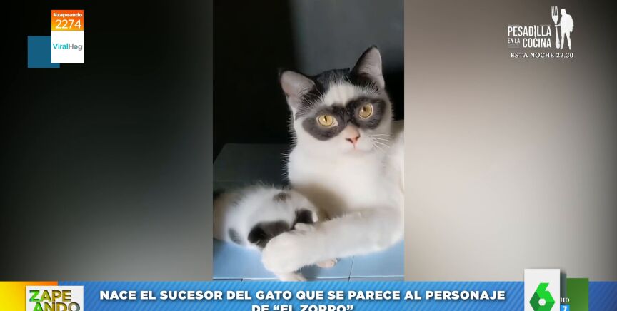 Sin embargo, en esta ocasión y para hacerles competencia, otro usuario ha compartido un adorable vídeo de su gato que tiene una mancha en la cara que simula una máscara: "Parece el personaje de El Zorro, el que interpretó Antonio Banderas", compara la de Vallecas, que está emocionada con que su cría haya heredado esta máscara: "La descendencia del gatito enmascarado ya está asegurada". "Parece que te viene a robar la casa", espeta Quique Peinado provocando las risas en plató al ver estas imágenes que te dejamos sobre estas líneas.