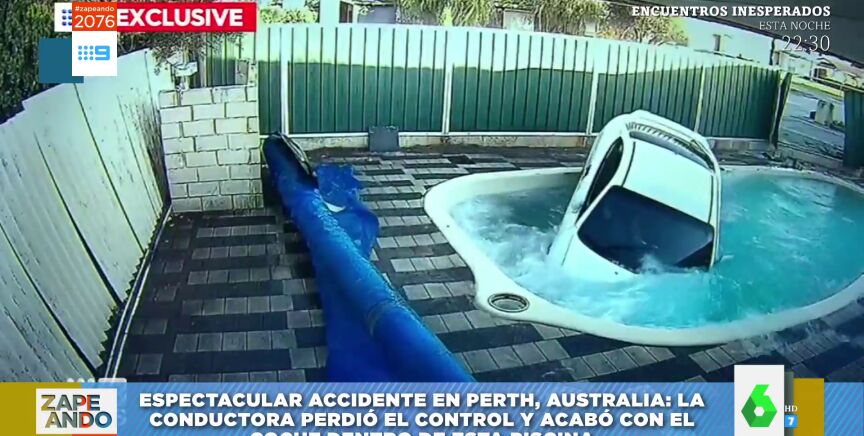 "¿Os imagináis que estáis muy tranquilos en vuestro salón viendo Zapeando cuando, de repente, un coche descontrolado cruza por delante de vuestra casa y acaba en vuestra piscina?", pregunta Quique Peinado a sus compañeros. Esto es lo que ha sucedido en Perth, Australia. Una conductora ha perdido el control de su vehículo y ha terminado con el coche en la piscina de una casa particular. Tal y como se ve en el vídeo, para sacarla los vecinos se lanzaron rápidamente al agua y "forcejearon" para abrir las puertas. También intentaron romper los cristales con el brazo.