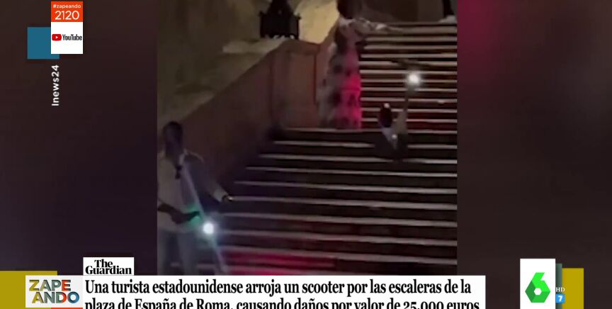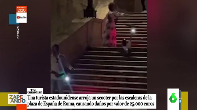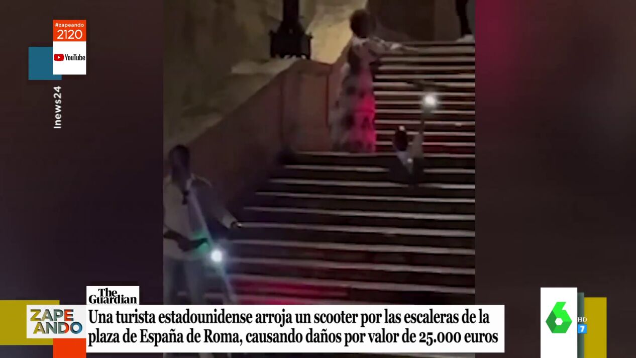 "Quiero arrancar el programa con un aviso", comenzaba Dani Mateo Zapeando, y es que "si es estáis en el extranjero tengáis mucha atención con las señales de tráfico para que no os pase como a esta pareja de turistas británicos", que han tirado un patinete eléctrico por las escalinatas de la Plaza de España de Roma y han causado daños por valor de 25.000€. "Es que allí todo vale mucho dinero porque tiene muchos siglos de antigüedad", apunta el presentador, "todo es un monumento".