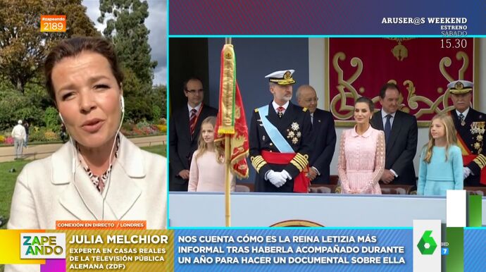 Dani Mateo conecta en directo con alguien que la ha seguido durante un año para hacer un documental sobre ella: la periodista alemana, especializada en Casas Reales, Julia Melchior. La periodista desvela en este vídeo de Zapeando cómo se ha comportado con ella la reina Letizia durante este año en el que la ha seguido para hacer un documental sobre la monarca española.