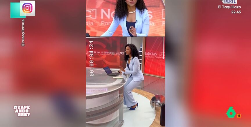 Lejos de inmutarse, la presentadora tiró de profesionalidad y siguió adelante con la información mientras exhibía un espectacular dominio de sus cuádriceps en una postura de lo más incómoda.