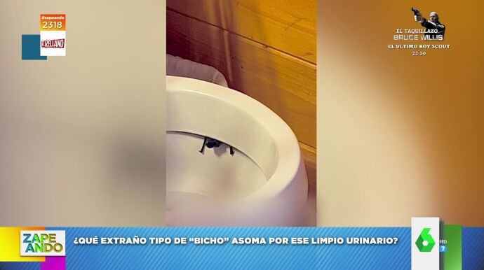 Un extraño animal aparece dentro de un retrete ante el asombro de la persona que graba este vídeo viral. "¿Una araña o un bicho de los urinarios, qué es lo que asoma por este retrete?", pregunta Miki Nadal a los zapeadores, y Dani Mateo está seguro de que es un murciélago.