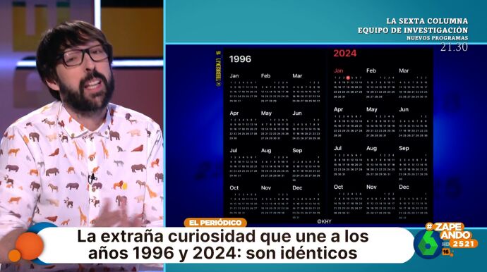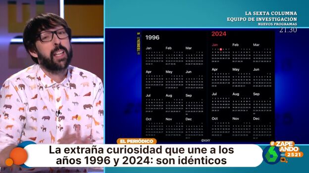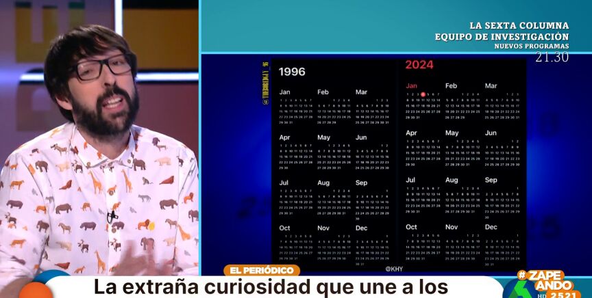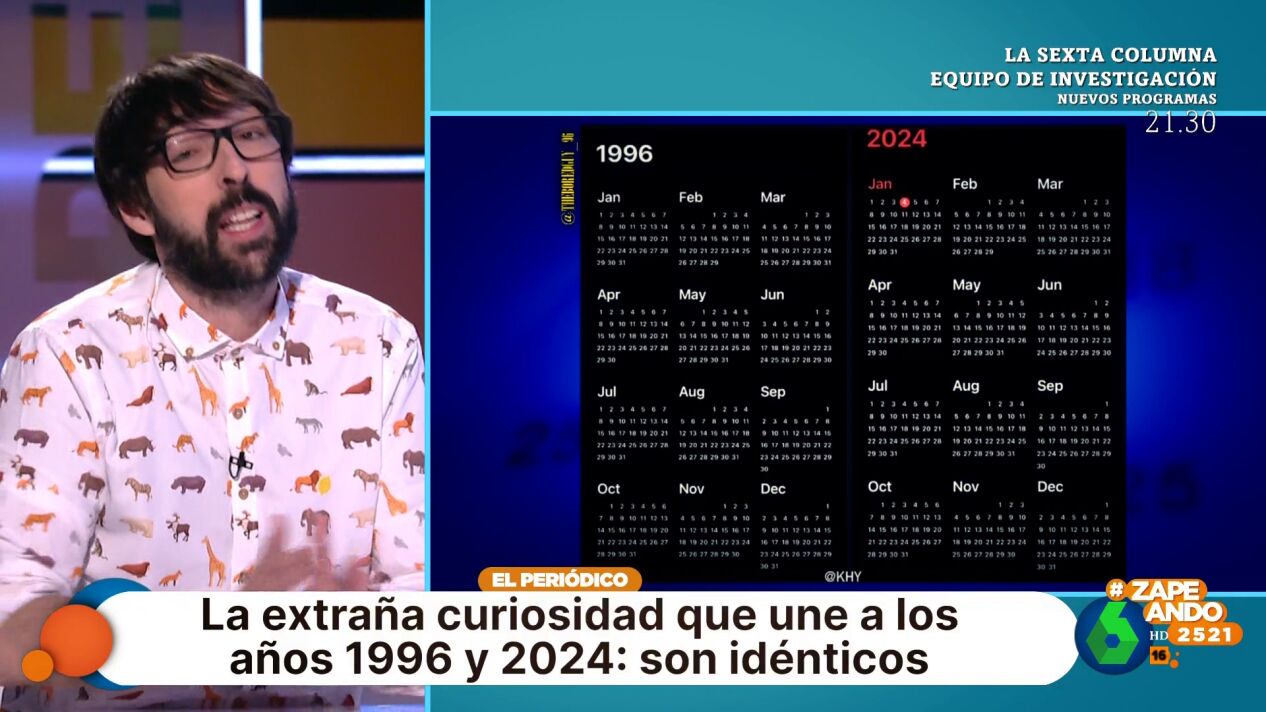 Quique Peinado rescata una curiosidad de la que se han dado cuenta usuarios de Twitter. Se puede reciclar el calendario de 1996. "No hace falta que compres un calendario", señala el colaborador de Zapeando. Peinado cuenta que esto pasa cada vez que pasan siete años bisiestos, pasa.