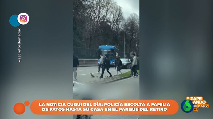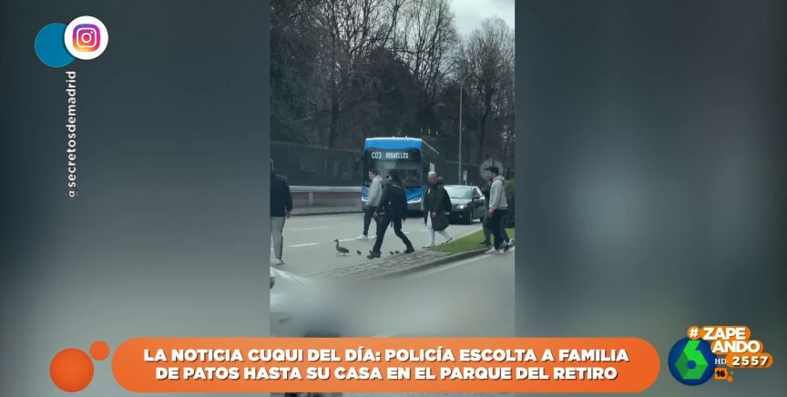 La policía ayuda a una familia de patos a atravesar una de las vías próximas al parque de El Retiro en su vuelta a casa. Puedes ver este momento en el vídeo de Zapeando.