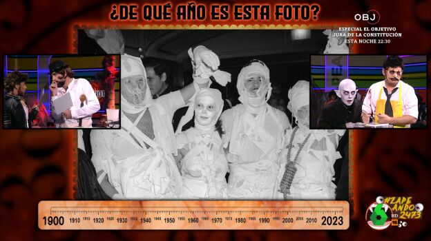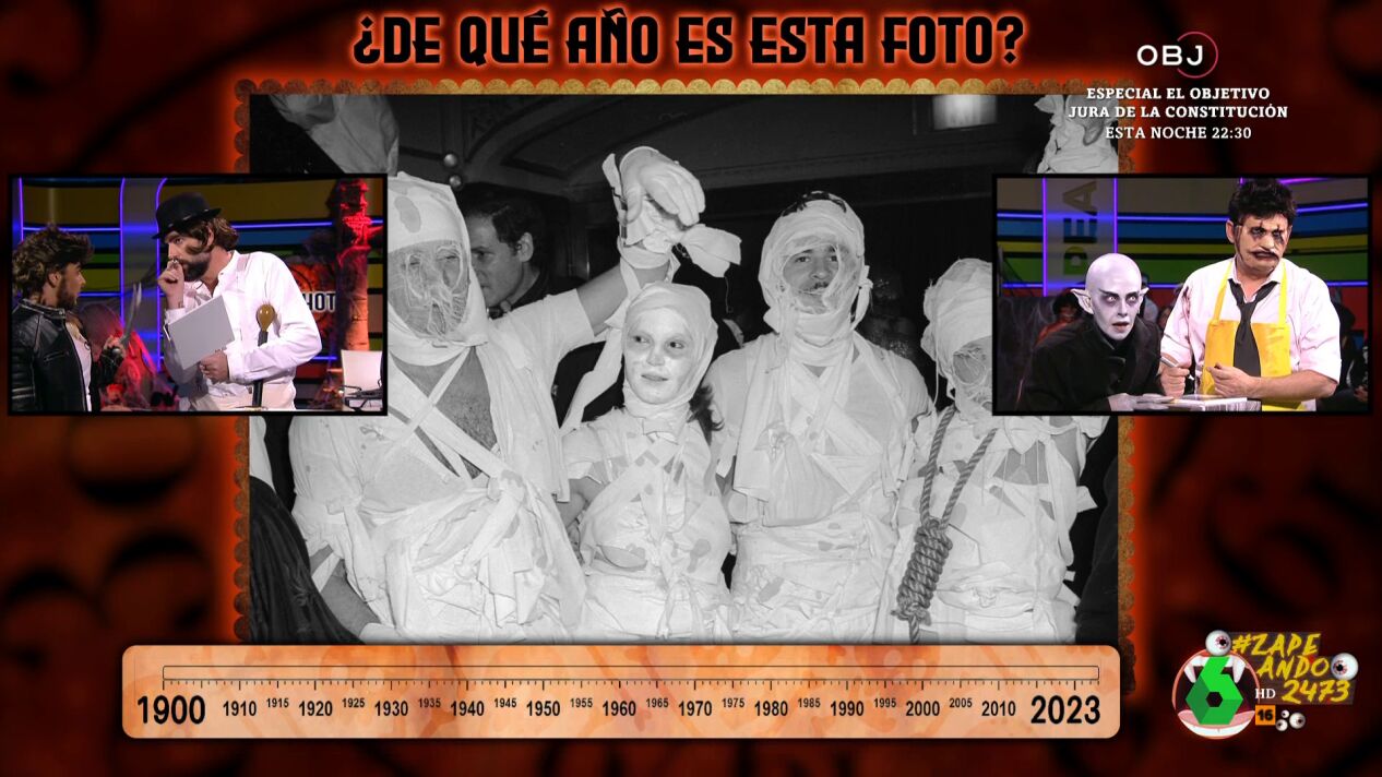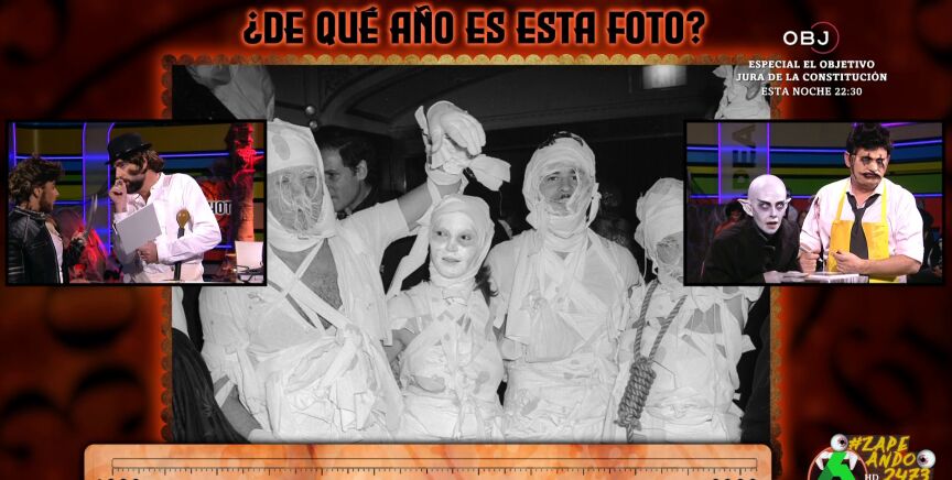 Dani Mateo y Valeria Ros se quedan muy cerca de adivinar el año de la primera imagen, en la que aparecen dos personas disfrazadas de brujas y que portan una escoba y una calabaza. Cristina Pedroche y Miki Nadal, recortan distancias con la segunda fotografía, que muestra a un grupo de amigos vestidos de momias, ya que, a pesar de estar en blanco y negro, el presentador la sitúa en un año bastante reciente.