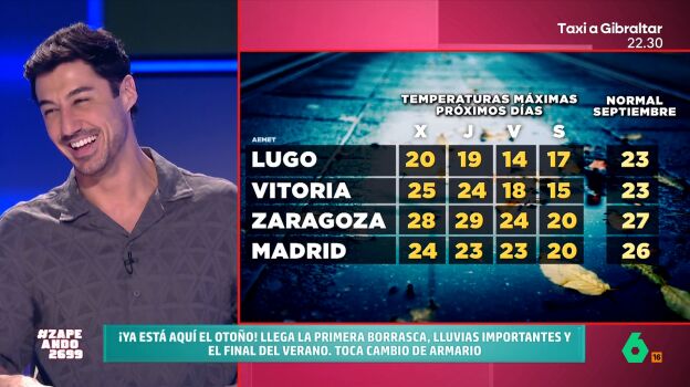 ¿Qué tiempo nos espera durante la semana? Francisco Cacho visita Zapeando para hacer un repaso de la previsión de los próximos días. Como explica, hasta mañana todavía se sufrirán los estragos de la DANA retrógrada que ha dejado mal tiempo en Cataluña y Baleares. "Mañana será un día de transición", explica, "pero miércoles, jueves y viernes va a llegar la primera borrasca del otoño".